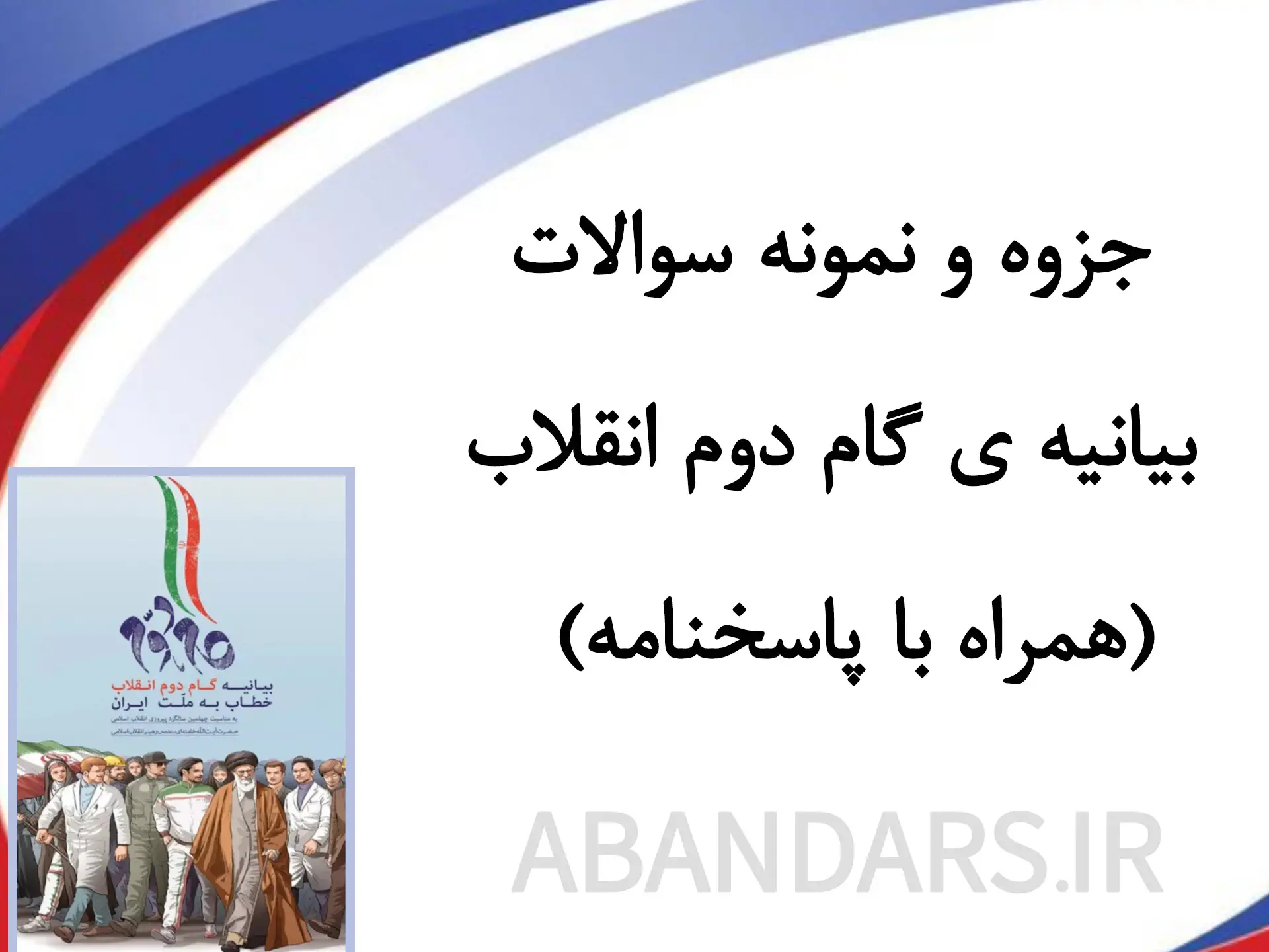 نمونه سوالات آزمون بیانیه گام دوم انقلاب که در آبان درس ارائه شده، بر اساس سوالات پرتکرار آزمونهای قبلی و منابع معتبر گردآوری شده است. این مجموعه شامل تستهای چهارگزینهای و سوالات تشریحی به همراه پاسخنامه میباشد. با تمرین این سوالات شما با سبک طراحی سوالات آشنا میشوید و میتوانید نقاط ضعف خود را قبل از آزمون اصلی برطرف کنید.