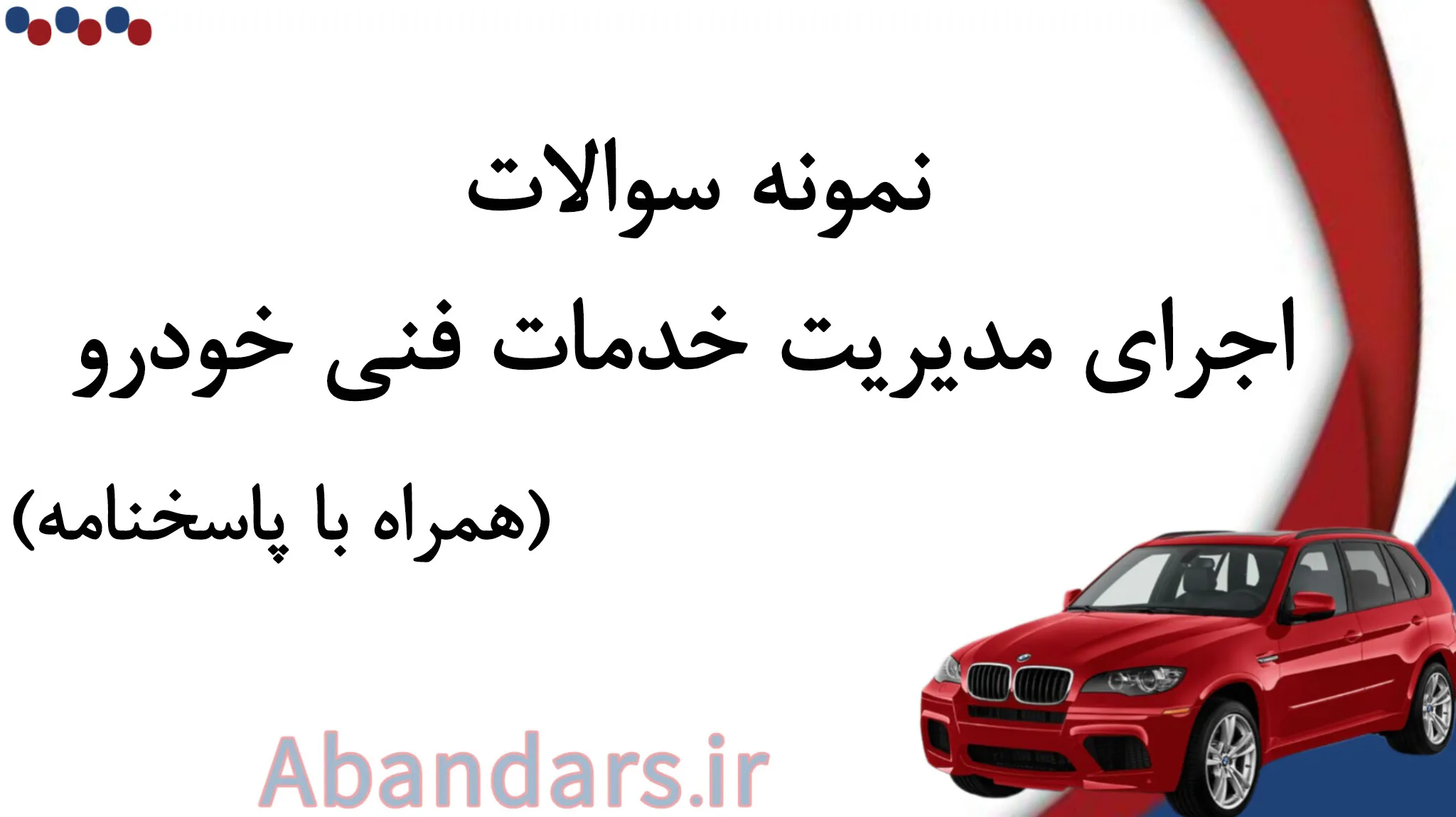 در آباندرس مجموعهای از سوالات اختصاصی این رشته تهیه شده که تمامی محورهای اصلی مانند ساختار مدیریت تعمیرگاه، روشهای برنامهریزی سرویسهای دورهای، کنترل فرآیند پذیرش و تحویل خودرو، مدیریت منابع انسانی فنی، اصول روانشناسی مشتری و استانداردهای کاری صنعت خودرو را پوشش میدهد.